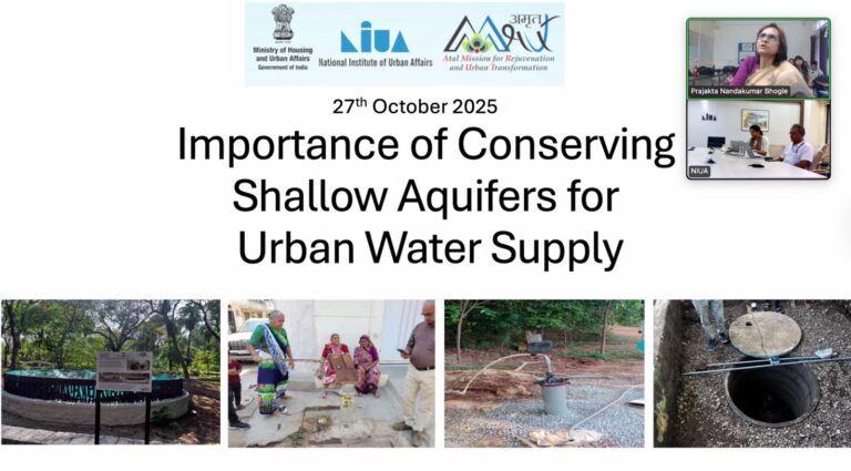 On 27th October, Dr. Uday Bhonde (Senior Programme Specialist, NIUA) delivered an online guest lecture on “The Importance of Conserving Shallow Aquifers for Urban Water Supply” at the School of Planning and Architecture (SPA), Bhopal, for the Master’s students of Environmental Planning. The session sparked lively participation, with students gaining valuable insights into the role of shallow aquifers in enhancing urban water resilience and sustainability.